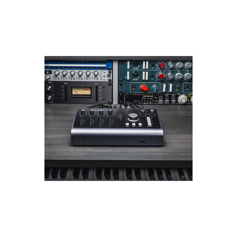 Изходната конфигурация включва четири балансирани линейни изхода за мониторинг, както и три слушалкови изхода – два ¼" TRS и един 3.5 mm, захранвани от мощни слушалкови усилватели. Динамичният диапазон на слушалковите изходи достига 124 dB, което осигурява прецизен и мощен мониторинг при всякакви слушалки. Двата многосегментни LED метъра дават ясен визуален контрол върху нивата.