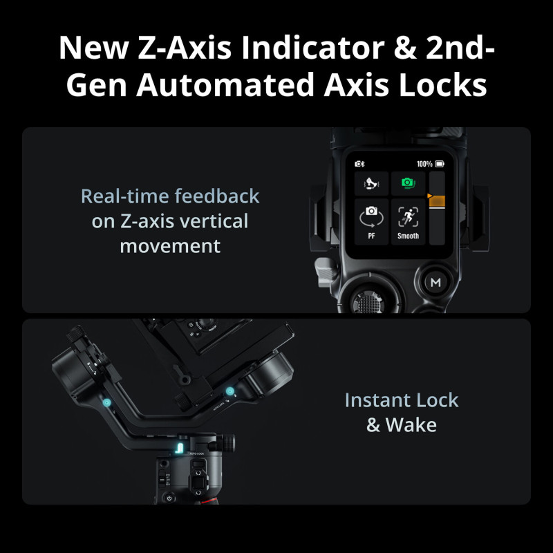 Голямо предимство на стабилизатора RS5 е вграденият OLED тъчскрийн, който дава бърз достъп до основните настройки и режими. Чрез него можеш лесно да се активира интелигентно проследяване на обекти с допълнителния модеул, да се сменят режимите на работа или да настройват параметрите според конкретната сцена. Това спестява време и елиминира нуждата от допълнителни устройства при контрол на гимбала.