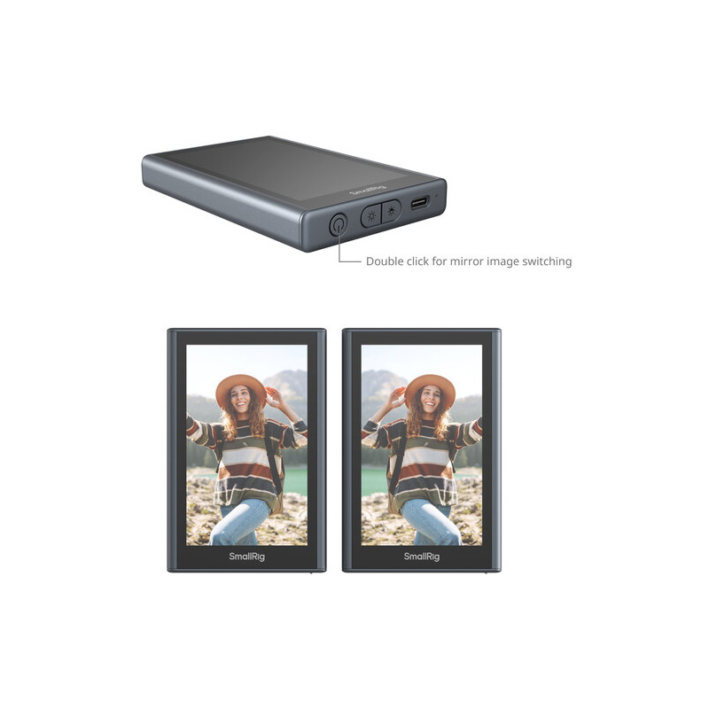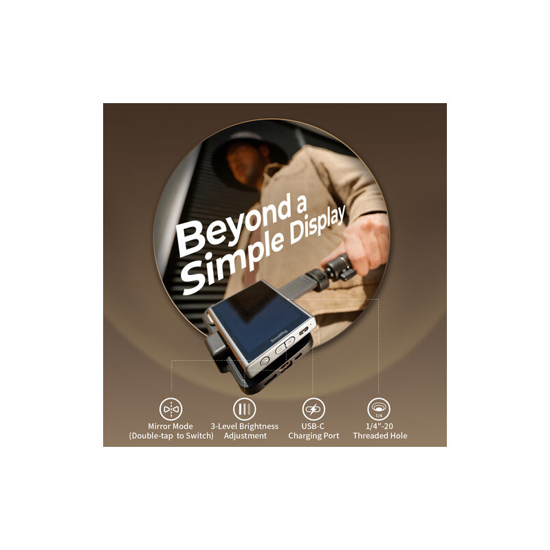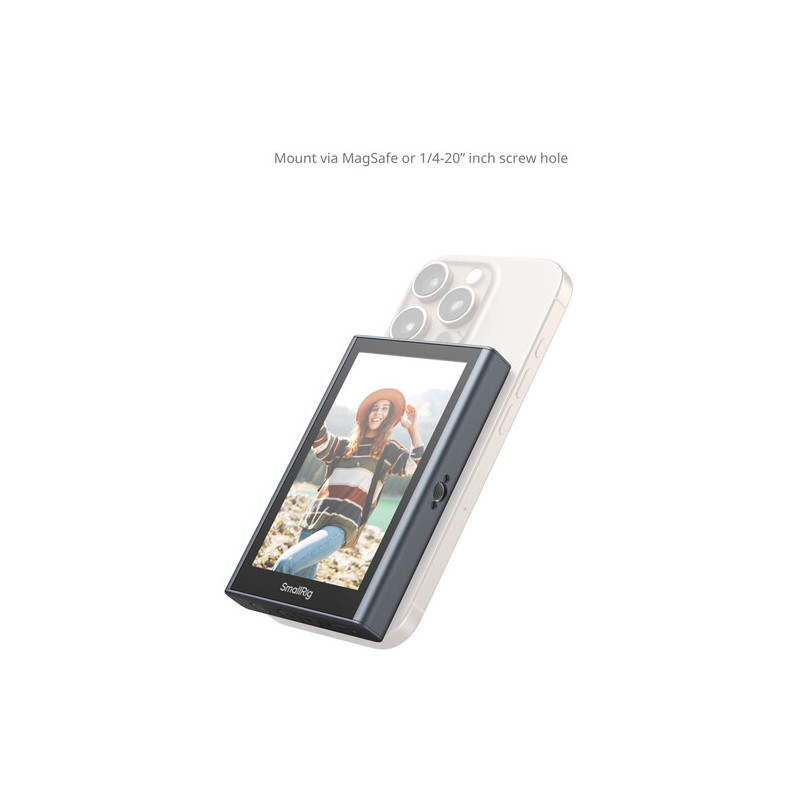 Мониторът разполага с 3.97-инчов LCD дисплей с резолюция 480 x 800 пиксела и яркост до 500 нита, което осигурява добра видимост при различни условия на осветеност. Компактният размер го прави удобен за монтаж директно върху смартфон чрез MagSafe магнитната система на гърба. Допълнителната 1/4"-20 резба отстрани позволява закрепване към статив, риг или друго оборудване.