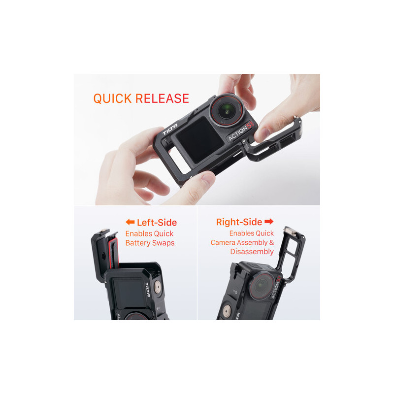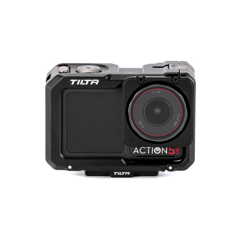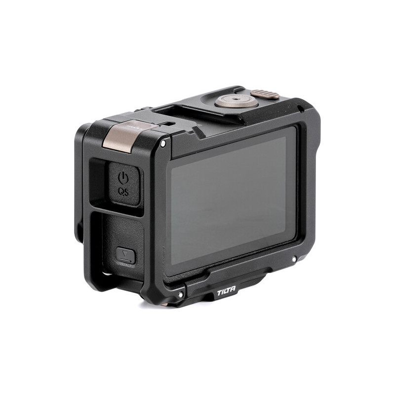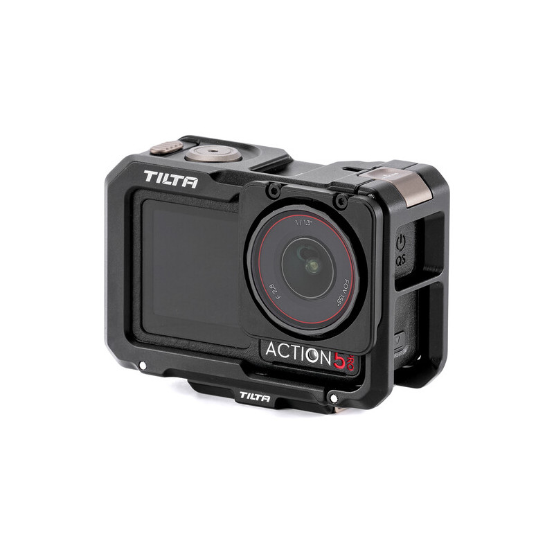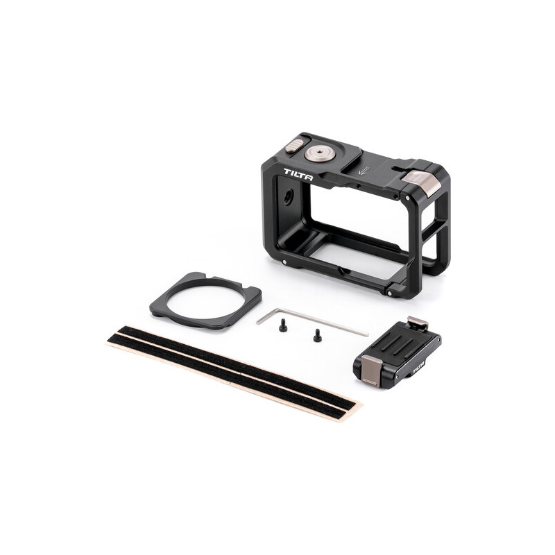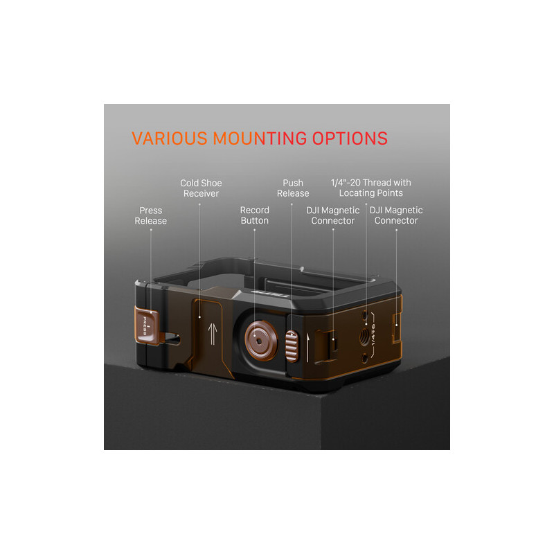 Кейджът разполага с множество монтажни точки, които разширяват възможностите за конфигуриране. Отстрани е наличен DJI магнитен конектор за бързо и сигурно закрепване, както и 1/4"-20 резба за стандартни аксесоари. В горната част е интегриран cold shoe адаптер за микрофон или LED осветление. Отпред е предвиден Tilta Action Filter Mount за използване на филтри от системата Tilta Osmo Action Filter.