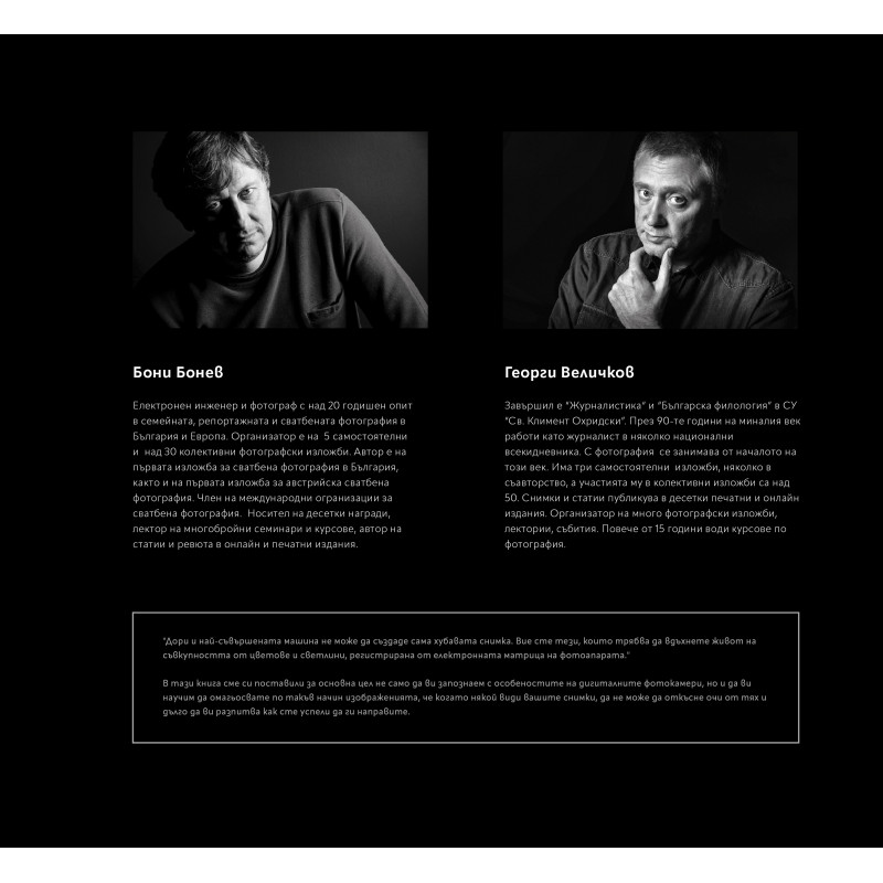 Бони Бонев и Георги Величков представят "Фотографията - твоята машина на времето". За първи път от български автори има толкова мащабна книга, обхващаща както техническите, така и идейните аспекти на цифровата фотография. Луксозното издание с твърди корици съдържа 216 стр. пълноцветен печат с много авторски фотографии, примери и подробни обяснения. Книгата е един чудесен коледен подарък за всеки любител на фотографията.