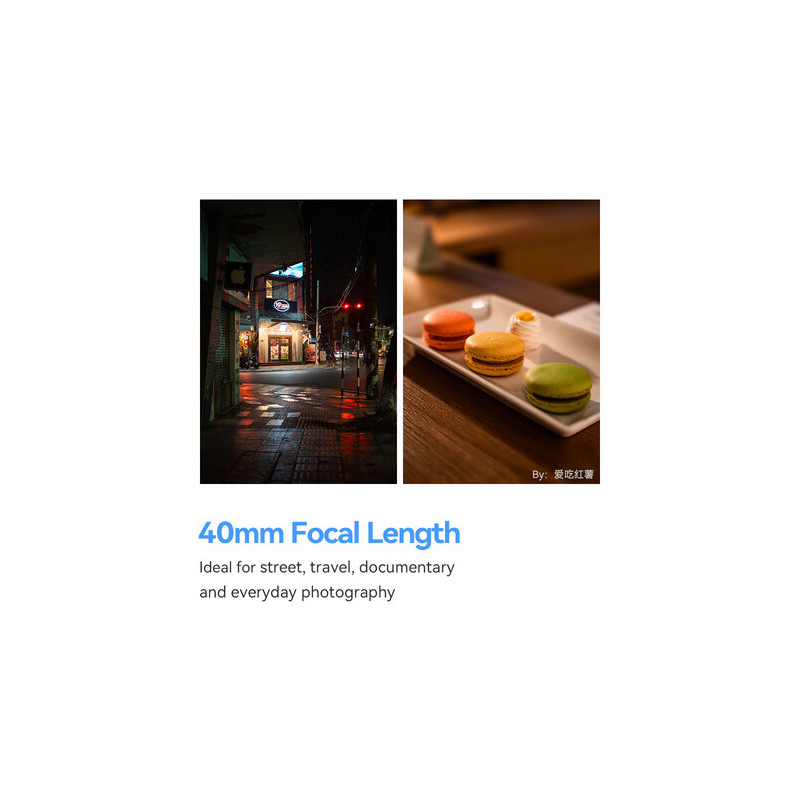 С диаметър 61 мм, дължина 44 мм и тегло 176 г, TTArtisan AF 40mm F/2 е изключително компактен и удобен за носене през целия ден. Филтърната резба е 52 мм, което позволява използване на широкоразпространени филтри.