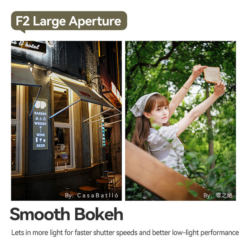 Максималната светлосила f/2 осигурява добра работа при по-слаба осветеност и позволява контрол върху дълбочината на рязкост. Обективът може да отделя обекта от фона с приятен дефокус, като същевременно остава достатъчно универсален за общи кадри. Минималната бленда f/16 дава възможност за по-голяма дълбочина при пейзажна или архитектурна фотография.