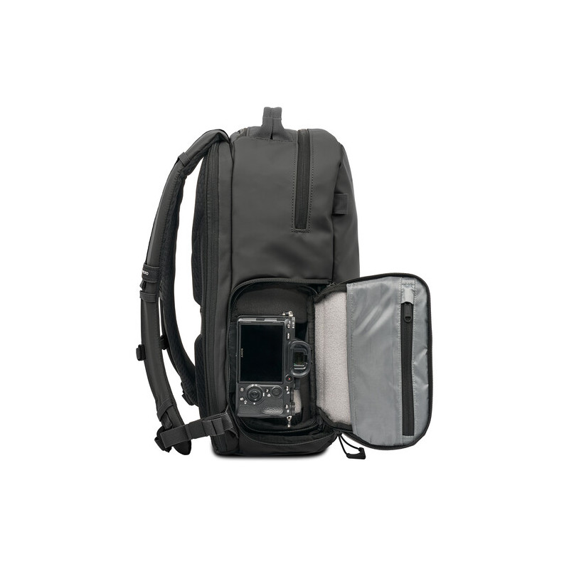 Раницата разполага с пълно отваряне тип clamshell, което позволява лесно подреждане на съдържанието и преглед на оборудването. Включеният Camera Cube осигурява сигурна организация и защита на техниката, като побира една или две безогледални камери и 3 до 5 компактни обектива, както и допълнителни аксесоари като батерии и кабели. Вътрешната конфигурация може да се адаптира спрямо нуждите чрез регулируеми разделители.