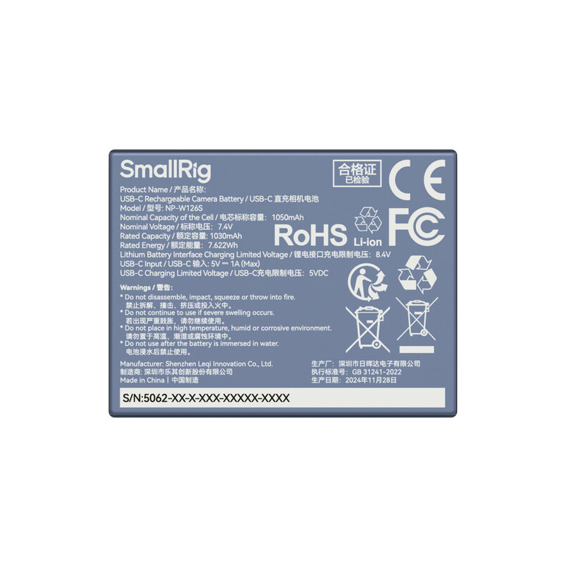 Smallrig 5062 USB-C Rechargeable Camera Battery NP-W126S