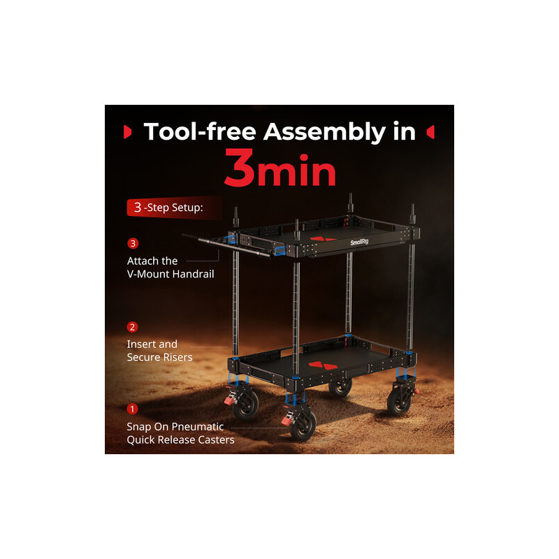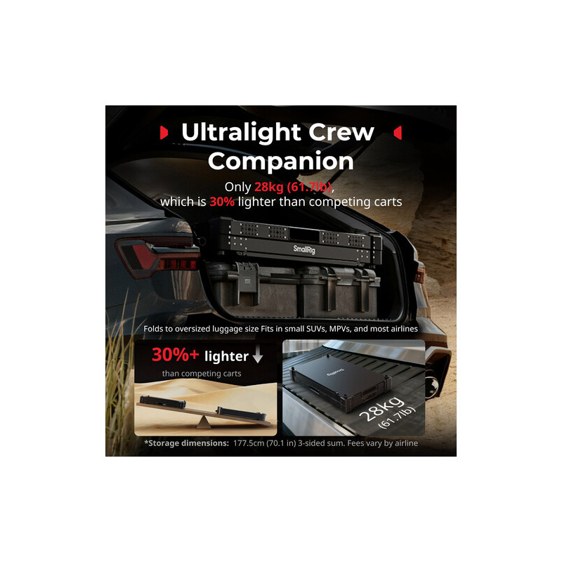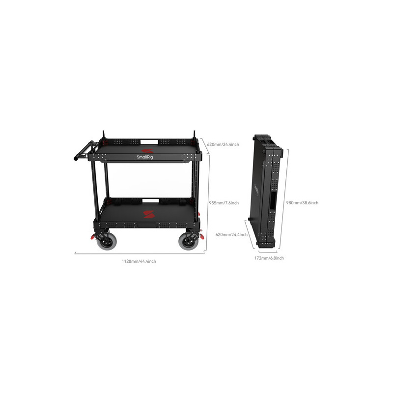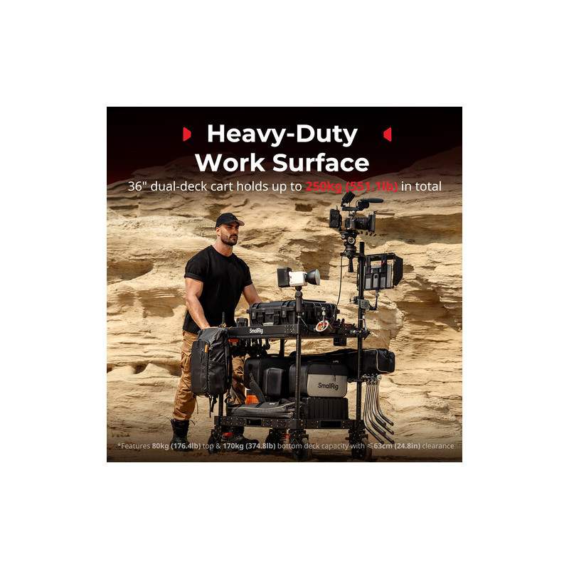 Аксесоарът SmallRig 4573 36'' Lightweight Video Camera Cart е професионална количка за видео продукция с товароносимост до 249.9 kg, двуетажна конструкция, 36-инчова платформа и сгъваем дизайн за лесен транспорт. Изработена от алуминий, неръждаема стомана и найлон, тя предлага стабилност и издръжливост при работа с тежко оборудване. Оборудвана е с 4 големи 8-инчови пневматични колела със заключване, които осигуряват плавно движение върху различни терени. Моделът разполага с два рафта (плосък и дълбок тип), което позволява удобно организиране на техника и аксесоари.
