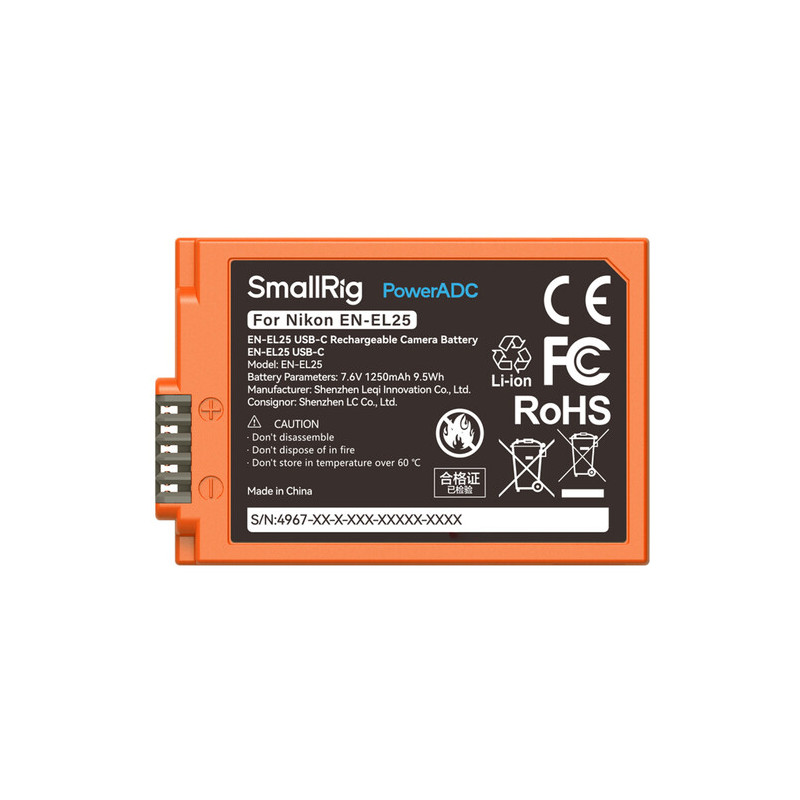 Батерията Smallrig 4967 EN-EL25 USB-C Battery Orange е презареждаема литиево-йонна батерия, създадена като директен заместител на Nikon EN-EL25, предлагаща USB-C зареждане, капацитет от 1250 mAh и компактни размери за удобна работа в движение. Батерията разполага с вграден USB-C порт, който позволява директно зареждане чрез power bank, лаптоп или стандартен адаптер, без нужда от външно зарядно. Пълното зареждане отнема около 1 час и 45 минути, а включеният USB-C към USB-A кабел осигурява готовност за употреба веднага след разопаковане.
