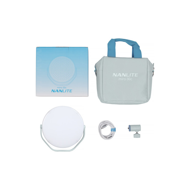 Осветлението Nanlite Miro 30C е компактна RGB LED лампа с кръгъл дизайн, съчетаваща пълен цветови контрол, регулируема цветна температура (2700K–7500K) и мощност от 30W в леко и мобилно тяло. С осветеност до 4854 lux на 1 метър (5600K), висок CRI 95 и TLCI 93, тя предлага надеждно и точно възпроизвеждане на цветовете, подходящо за видео, фотография и създаване на съдържание. Поддържа Bluetooth управление чрез приложението Nanlink, а захранването може да се осъществи чрез NP-F батерии или USB-C, което я прави изключително гъвкава за работа както в студио, така и на терен.