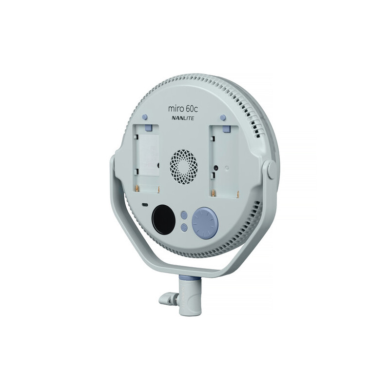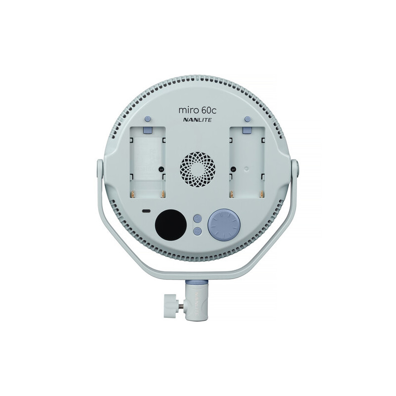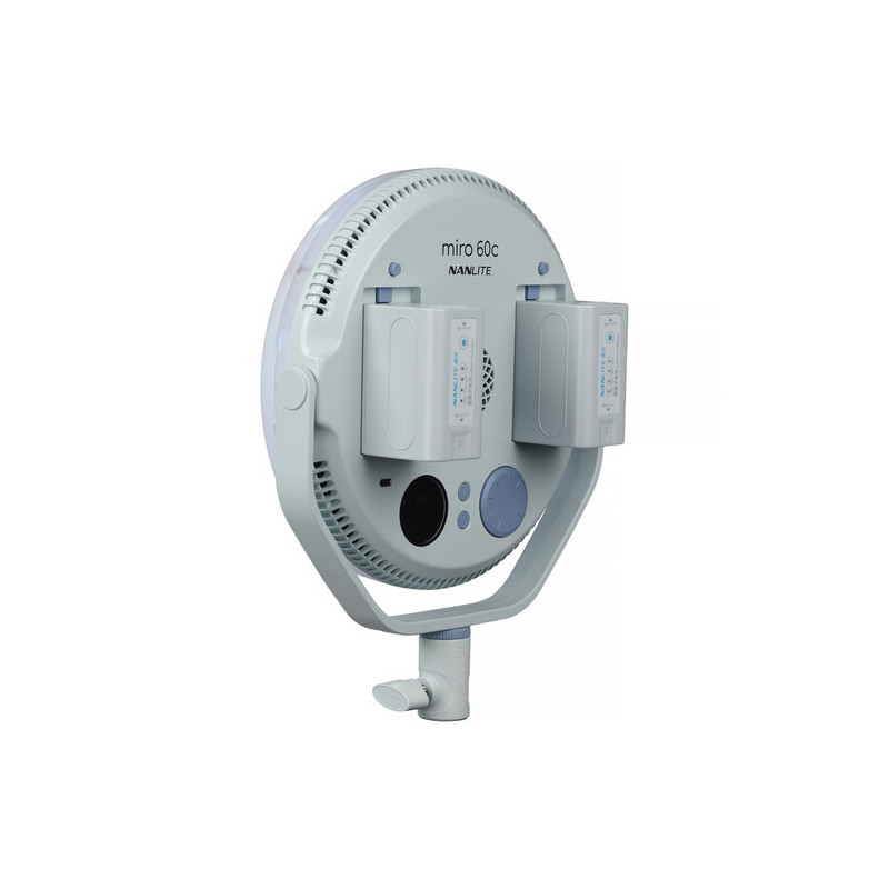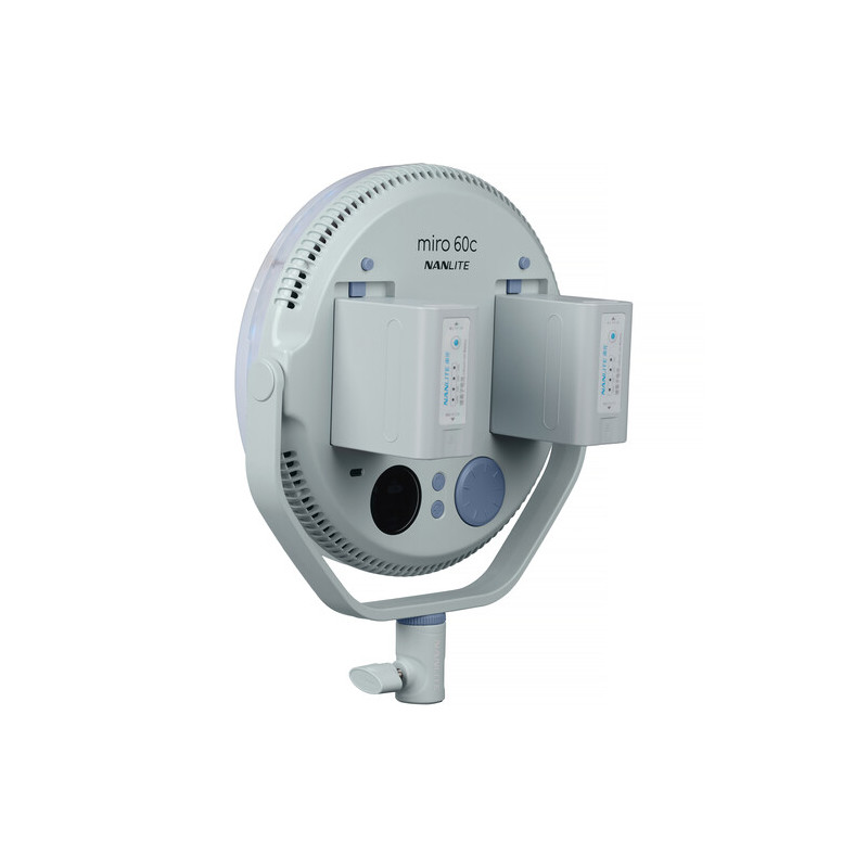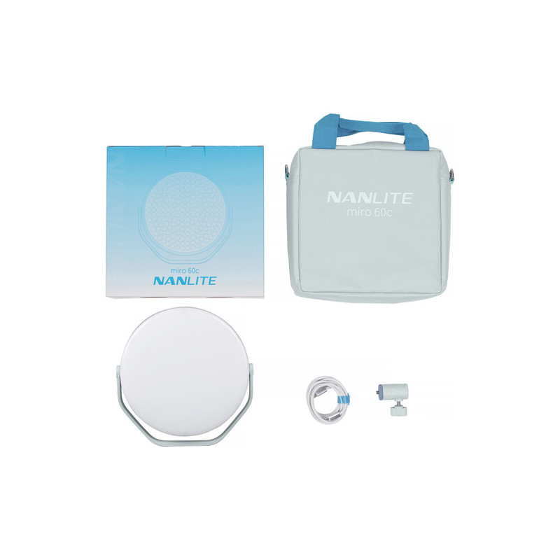 Осветлението Nanlite Miro 60C е мощна и компактна RGB LED лампа с кръгъл дизайн, която предлага пълен цветови контрол, регулируема цветна температура от 2700K до 7500K и мощност от 60W. С осветеност до 8382 lux на 1 метър (5600K), висока цветова точност (CRI 95, TLCI 93) и широк набор от режими (RGB, Daylight, Tungsten), тя е подходяща за професионално видео, фотография и създаване на съдържание. Поддържа Bluetooth управление чрез приложението Nanlink, а захранването може да се осъществи чрез две NP-F батерии или USB-C, което осигурява гъвкавост както в студио, така и при мобилна работа.