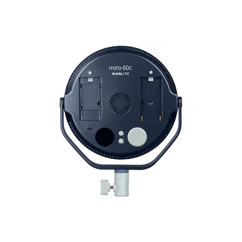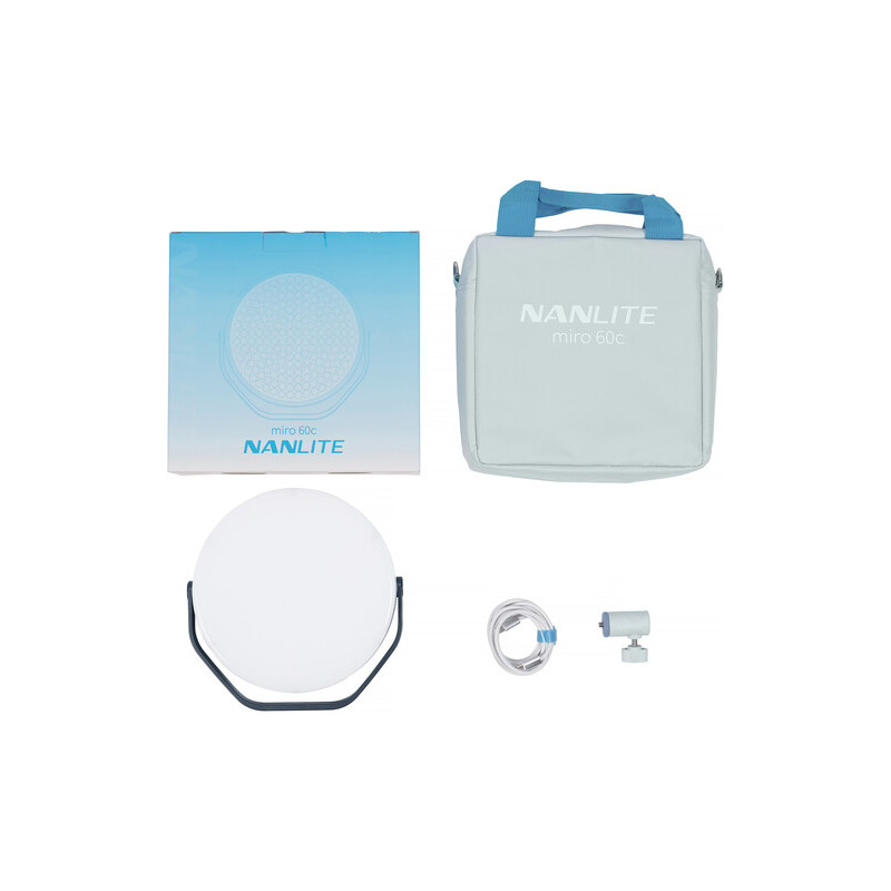 Осветлението Nanlite Miro 60C е мощна и компактна RGB LED лампа с кръгъл дизайн, която предлага пълен цветови контрол, регулируема цветна температура от 2700K до 7500K и мощност от 60W. С осветеност до 8382 lux на 1 метър (5600K), висока цветова точност (CRI 95, TLCI 93) и широк набор от режими (RGB, Daylight, Tungsten), тя е подходяща за професионално видео, фотография и създаване на съдържание. Поддържа Bluetooth управление чрез приложението Nanlink, а захранването може да се осъществи чрез две NP-F батерии или USB-C, което осигурява гъвкавост както в студио, така и при мобилна работа.