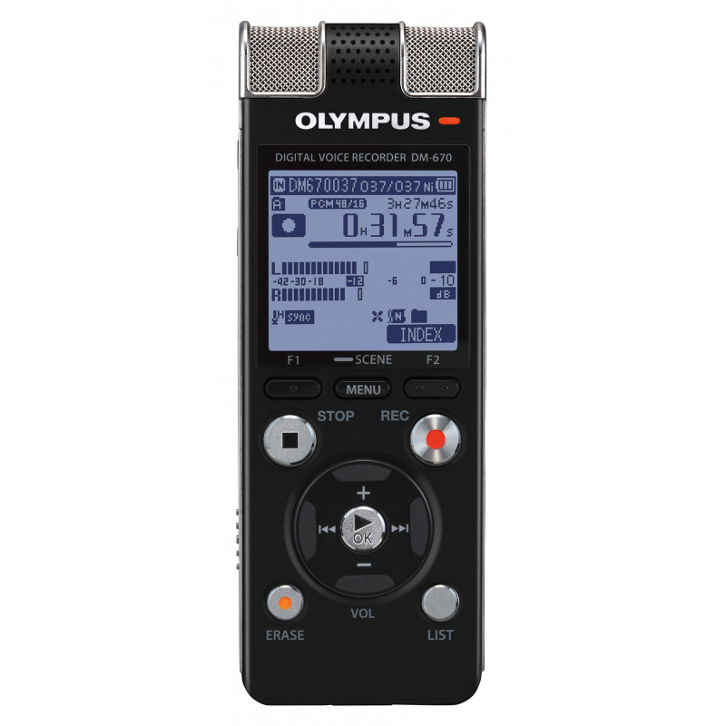 Атрактивният DM-670 разполага с пълна гама от професионални възможности за аудиозапис с кристално качество, в разнообразни формати, включително некомпресиран PCM формат, който е с по-високо от CD качество. Осигурява също редица удобства и отлично възпроизвеждане на музикални файлове, аудиокниги или дори подкасти. Двата вградени стерео микрофона в предишните модели DM-450 / DM-550 даваха възможност за запис на реалистичен и богат стерео звук, а инкорпорирането на трети, централен микрофон при DM-670 поставя качеството на ново, още по-високо ниво. Тази комбинация на микрофоните означава че записите, особено тези на човешките гласове, ще са още по-балансирани и реалистични, тъй като те покриват по-широк звуков диапазон - от ниски до високи честоти. Диктофонът разполага със система за гласови инструкции, възможност за поставяне на 99 индекс маркировки, 8GB вградена памет и слот за microSD карти, в случай че е необходим по-голям капацитет. Допълнителни функции като различни работни режими, нискочестотен филтър и автоматично стартиране на записа гарантират невероятни резултати, задоволяващи очакванията и на взискателните професионалисти.