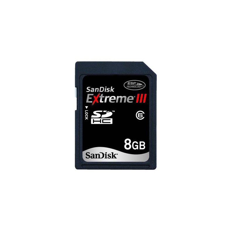 Code:254419145001- SecureDigital High Capacity (SDHC) Capacity - 8GB High Speed - up to 20Mbps Minimum Transfer Rate Resistant to Extreme Temperatures, Moisture, Shocks and Vibration Extreme III Extreme III cards are designed specifically to work with professional and semi-professional cameras are for fast handling of large image files High recording speed increases shooting speed Low power consumption Software to recover accidentally deleted files