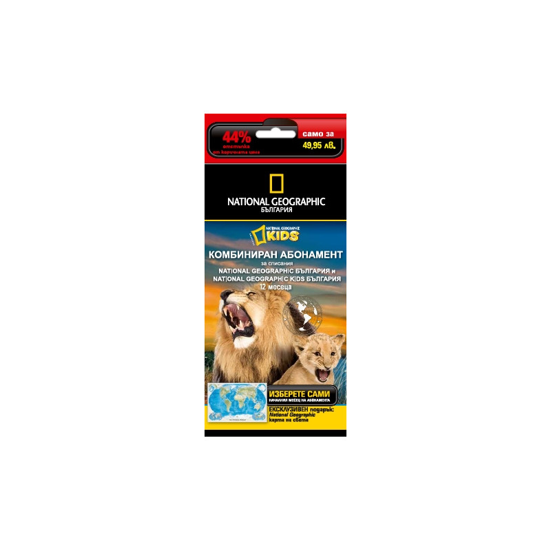 При сключване на 12-месечен абонамент спестявате 39,55 лева. Възползвайте се! Доставете радост на себе си и на своите деца!Всички абонати получават специална отстъпка при покупка на книги и други артикули с марка National Geographic от електронния магазин на www.nationalgeographic.bg