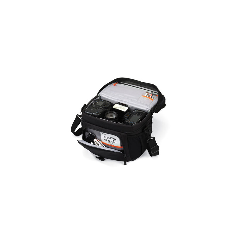 Code:262701010332- Compact bag for 1 professional SLR with zoom lens, 3-4 additional lenses, flash and accessories Convenient and fast access to the equipment Well padded shoulder strap Front pocket and memory card pocket Secure camera compartment