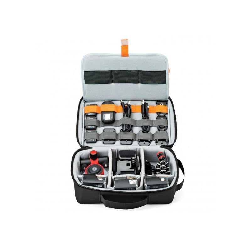 - Capacity: Three action cameras, accessories