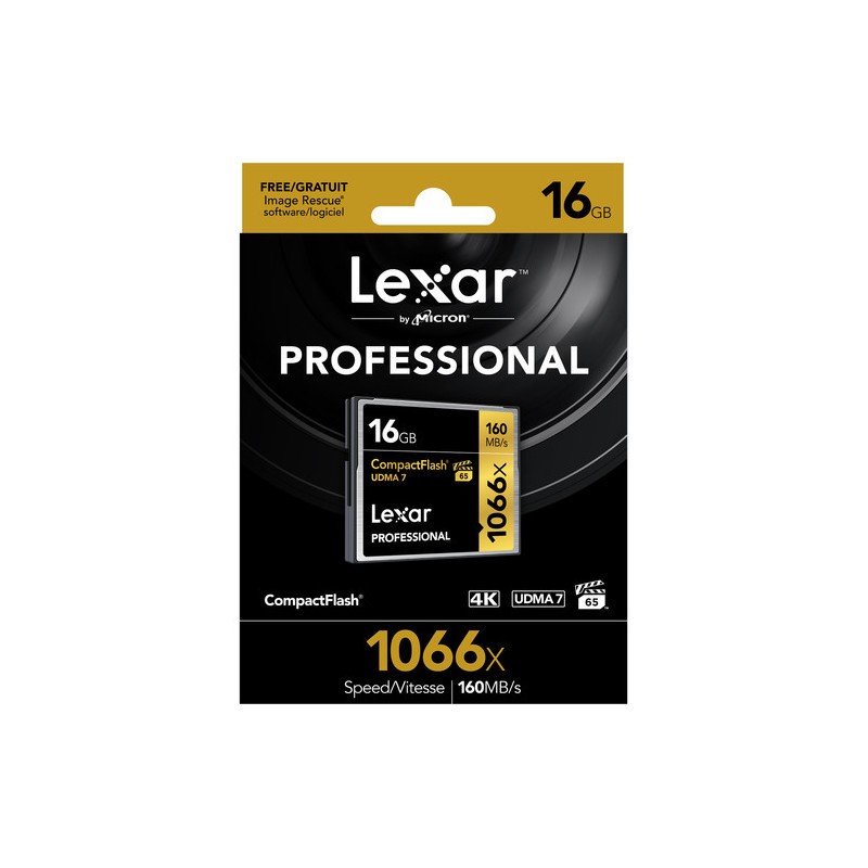 Code:113010026- Brand: Lexar Capacity 16 GB 1066x Max. Reading speed: 160 MB / sec Max. transfer rate: 95 MB / s Min. transfer rate: 65 MB / sec