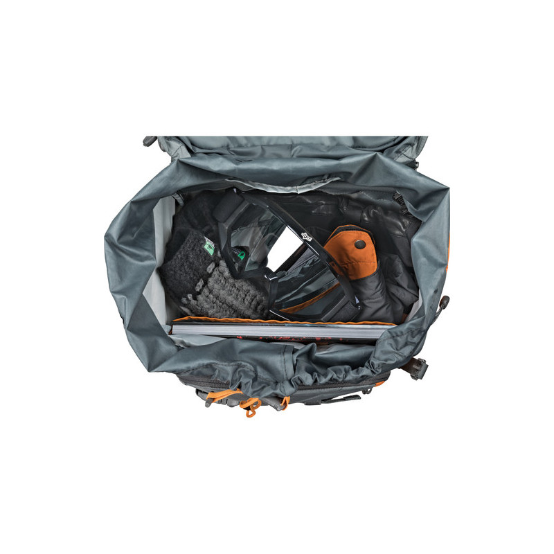 Separated from the main compartment by a waterproof partition, an expandable front pocket with a drain hole at the bottom allows wet equipment such as a climbing helmet, shovel or ice pick to dry even when carried in the pack. Between the main compartment and the waterproof front pocket is a dedicated sleeve that can hold up to a 15" laptop. It can also be accessed via a top zippered opening with capacity for books, notebooks, snow goggles or packed clothes.