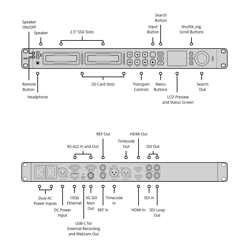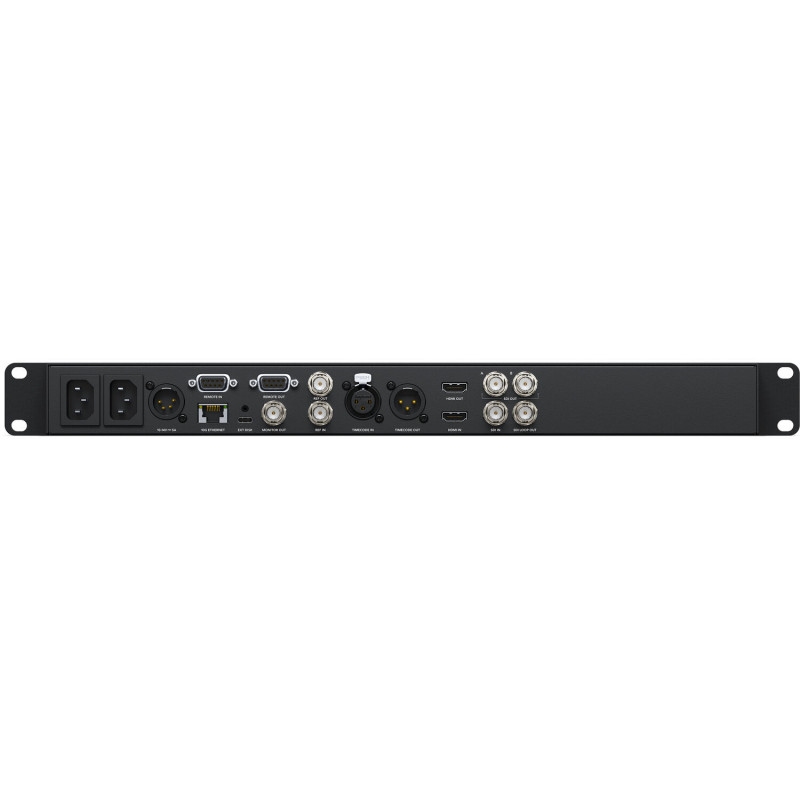 Blackmagic Design HyperDeck Studio 4K Pro is equipped with 12G-SDI input and two 12G-SDI outputs, loop-through SDI output and a special SDI output for monitoring, as well as HDMI input and output. All ports support video up to DCI 4K and automatically detect SD, HD and 12G-SDI format.