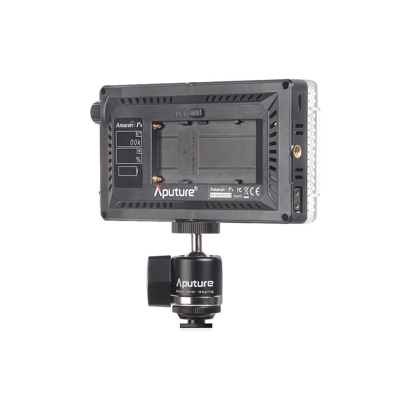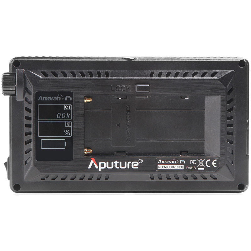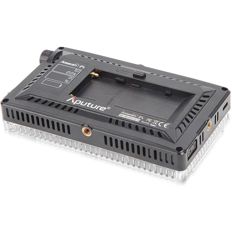 The Aputure Amaran AL-F7 Color LED Panel features a built-in display with information about the selected color temperature, brightness level and remaining battery charge. The housing has two standard 1/4"-20 mounting threads - one each on the bottom and side of the panel.