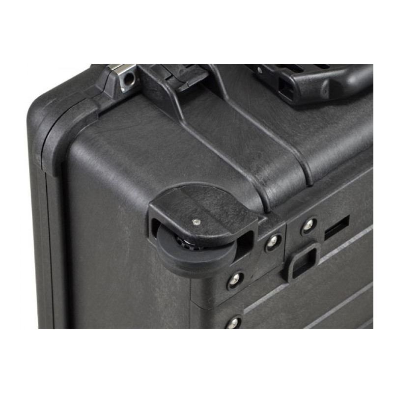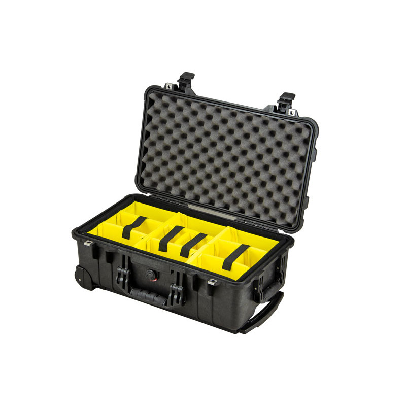 It has a movable and easy-to-release handle, sturdy wheels and "two-stage locks." altitude. Your equipment can fit in a high density foam case. Temperature range for working with Peli from -22C to +90 C.