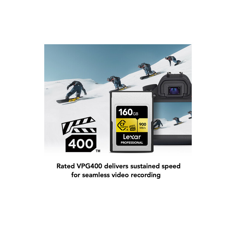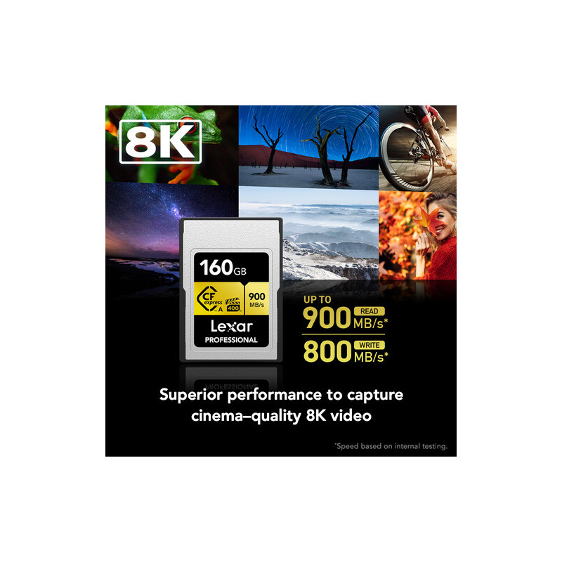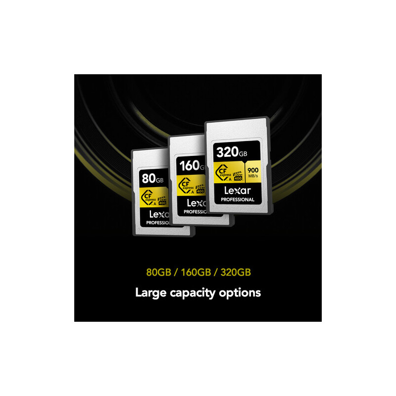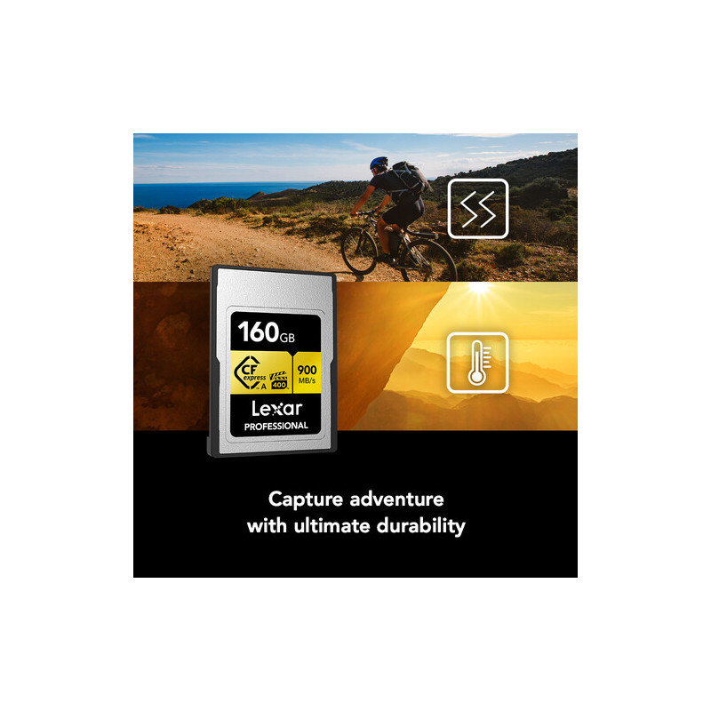 Lexar Professional CFexpress Gold 160GB Type A captures 8K, 4K, HFR video up to 120 fps with ease. The card is resistant to extreme temperatures (up to 85°C) , shock and vibration.