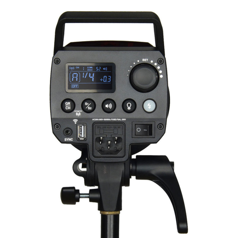 The recharge time is from 0.1 to 1.8 seconds with a pulse length of up to 1/2000 sec. The power is variable from 1/32 to full power, while the 10W LED modeling light can be adjusted from 5 to 100%. The built-in X system receiver allows remote triggering of the flash, and the Godox X1, X2 TTL radio synchronizer, as well as the Godox XT16 or FT16 allow wireless control of power, modeling light, etc.