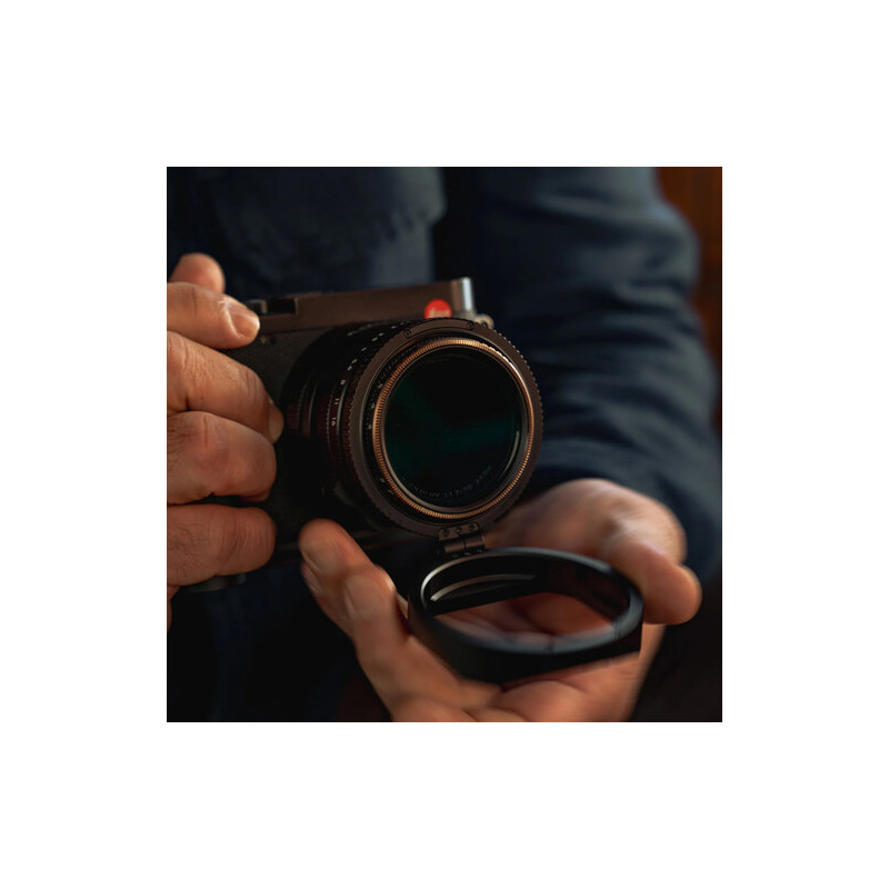 The advantage of the MagFlip Hood For Leica Q3 is that through the integrated mechanism at the bottom of the hood, you can lower the hood down without having to remove it, which allows you to easily change the filter you are using or work with rotating CPL or VND filters.