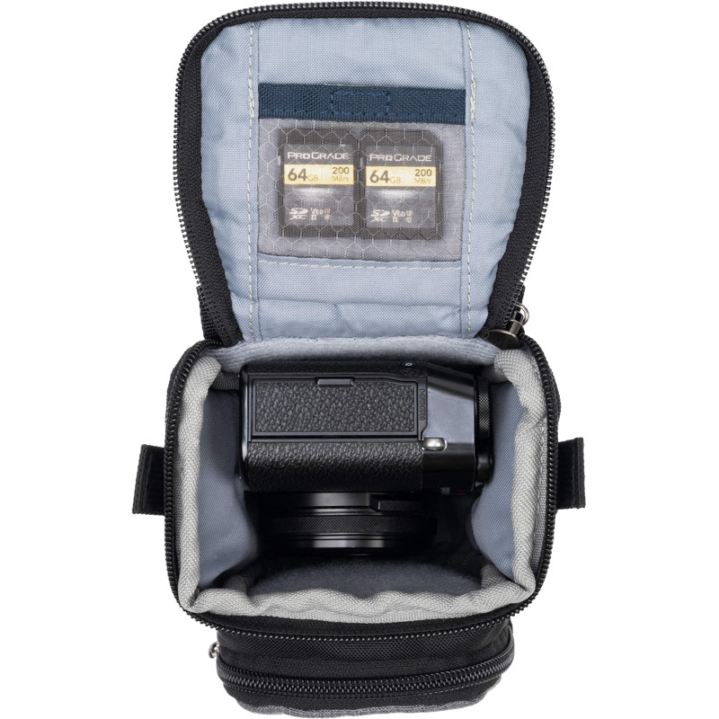 The Mirrorless Mover 10 V2 can accommodate a compact camera with fixed lenses such as the Fujifilm X100VI, Ricoh GR III/IIIx, etc. It also has space for accessories as the main compartment closes with a zipper and has a removable padded divider. The bag offers quick top access to the interior, which features a mesh pocket for memory cards, batteries and other accessories. On the front of the Mirrorless Mover 10 V2 there is also a zippered pocket for personal items and accessories as the lid of the bag has a magnetic closure and covers both compartments for greater security.