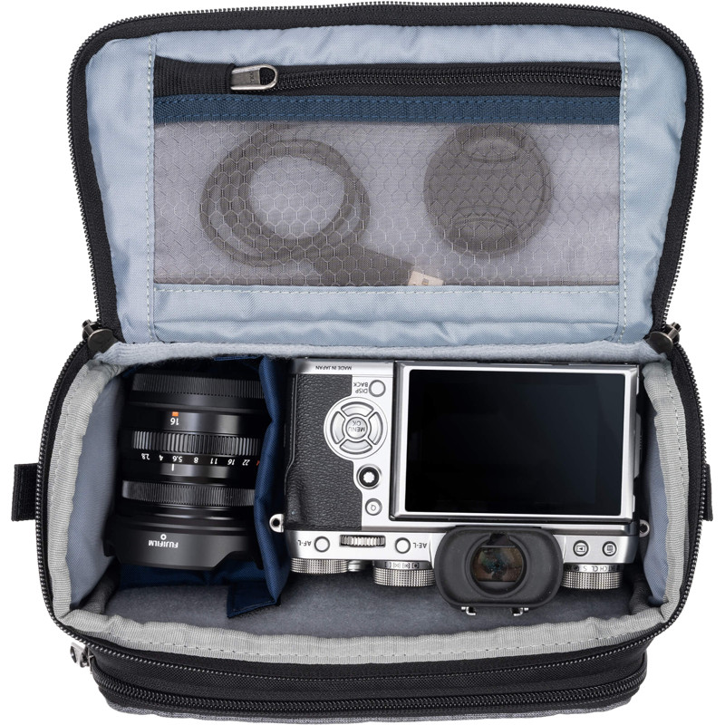 The Mirrorless Mover 20 can accommodate a mirrorless camera with 1-2 lenses up to 24-70mm F/4 and accessories, with a main compartment that zips shut and features two removable padded dividers, one of which has a dedicated space for a smartphone. The bag offers quick top access to the interior, which features a mesh pocket for memory cards, batteries and other accessories. The front of the Mirrorless Mover 20 also features a zip pocket for personal items and accessories, while the bag's lid has a magnetic closure and covers both compartments for added security.