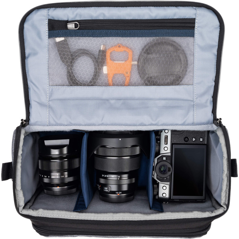 The Mirrorless Mover 30 V2 can accommodate a mirrorless camera with 2-4 lenses up to 70-200mm F/4 and accessories, with the main compartment zipped shut and featuring two removable padded dividers, one of which has a dedicated space for a smartphone. The bag offers quick top access to the interior, which features a mesh pocket for memory cards, batteries and other accessories. The front of the Mirrorless Mover 30 V2 also features a zip pocket for personal items and accessories, while the bag's lid has a magnetic closure and covers both compartments for added security.