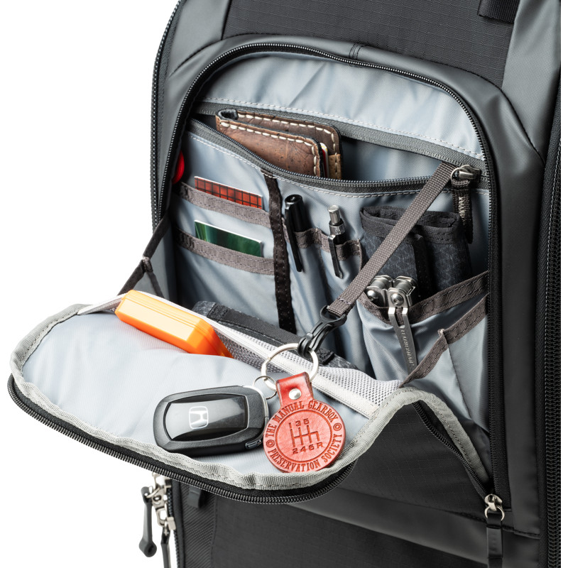 The spacious, padded main compartment with adjustable dividers holds a professional DSLR with a 200–400mm f/4 lens attached, seven additional lenses, a flash, and the included rain cover. Under the lid are zippered mesh pockets for accessories. At the back of the backpack is a compartment for up to a 15" laptop. Side pockets are suitable for storing a water bottle, gloves, or other accessories. Expandable pockets on the shoulder straps are useful for storing sunglasses or other small items. Above each pocket is a D-ring for attaching a front camera or other equipment.