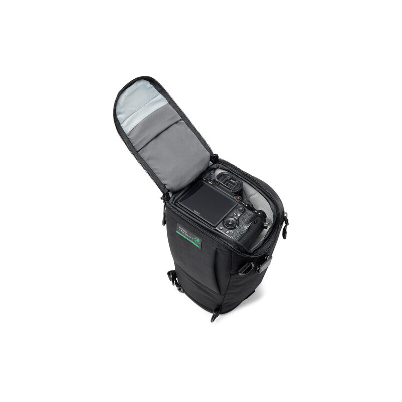 A full-length zippered top opening offers quick and convenient access to your gear. The bottom of the bag can be expanded when needed for lens changes. A separate shallow accessory pocket on the lid gives you easy storage for batteries, memory cards, and cables.