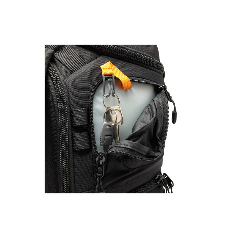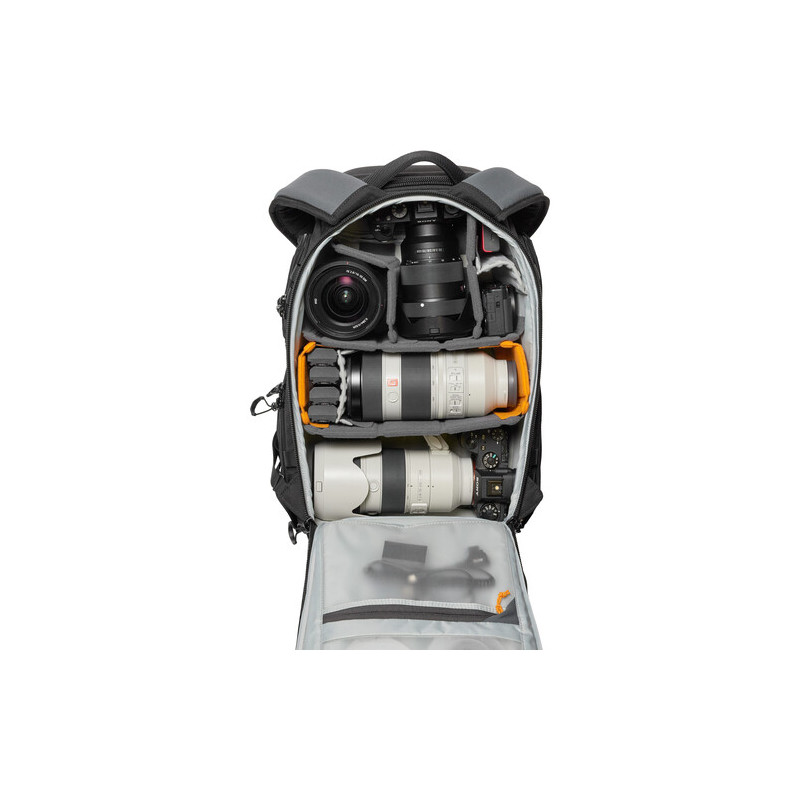 The backpack features three different ways to access your gear via side panels, a wide top opening, and full back access, allowing for lightning-fast response when shooting on the move. The interior is organized with MaxFit dividers that can be configured to suit individual needs and equipment needs. The CradleFit compartment holds up to a 14-inch laptop, protected from impacts and pressure.