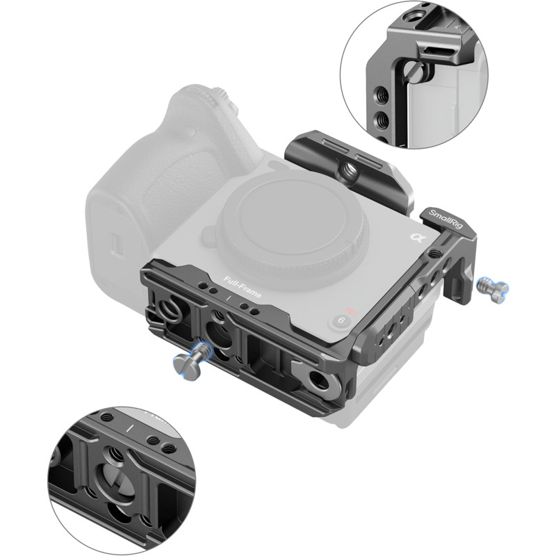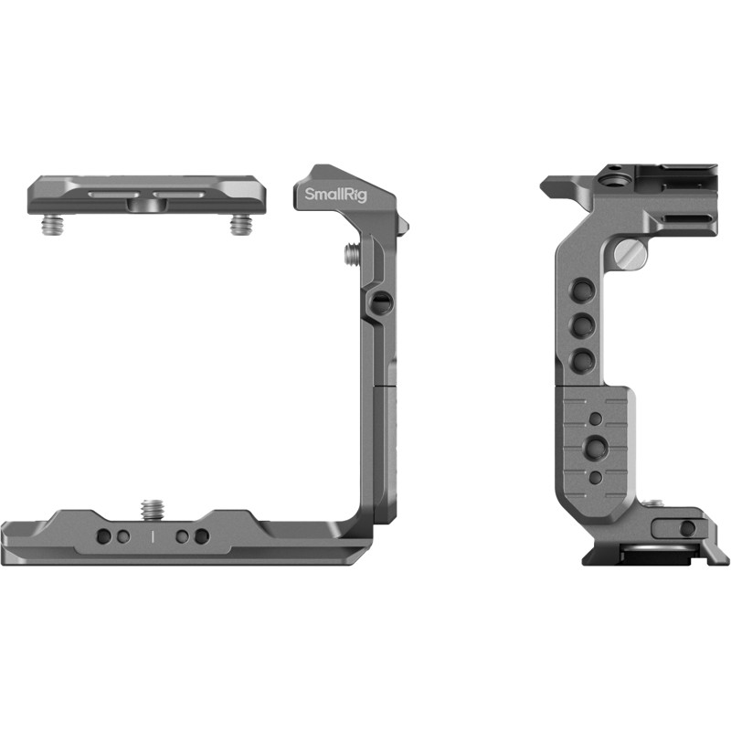 The cage offers a wide range of mounting points: multiple 1/4"-20 threaded holes, ARRI 3/8"-16 locking holes, QD socket and strap slot. This allows for easy addition of additional accessories such as handles, magic arms, brackets and various straps that improve shooting comfort and functionality.