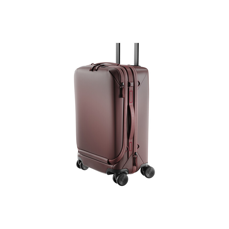 It features a carbon fiber SlimDrive telescopic handle and quiet, built-in wheels for smooth movement. The bridge-style opening provides full access to the contents without the need to fully unfold, and the internal organization panel rolls up when not in use. A dedicated compartment holds a laptop up to 16" (e.g. MacBook Pro), secured with a magnetic SnapTent closure, and a hidden pocket allows for an AirTag or Tile tracker.