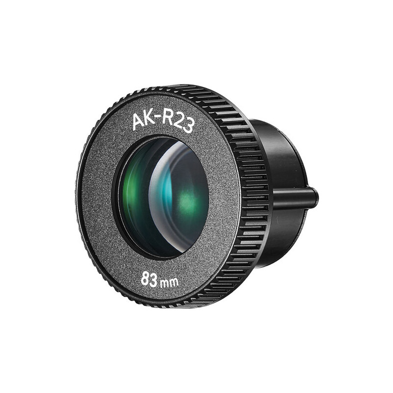 The Godox AK-R23 83mm Lens for AK-R21 is specifically designed for use with the AK-R21 Projection Attachment and serves to precisely control the angle of the projected light beam. When mounted onto the AK-R21, it delivers a narrower projection angle, making it ideal for scenarios that require more focused lighting or creative light effects.