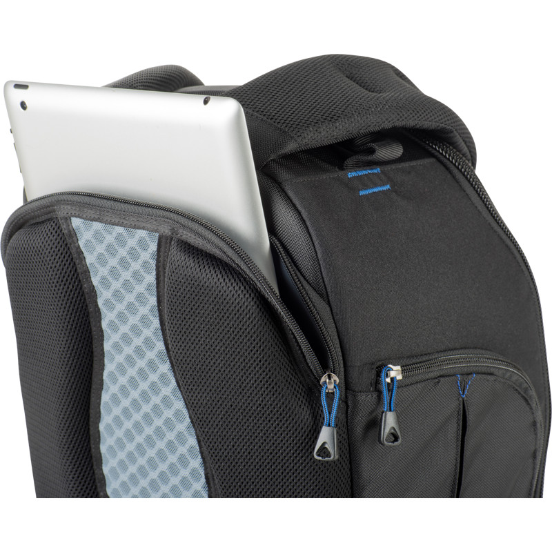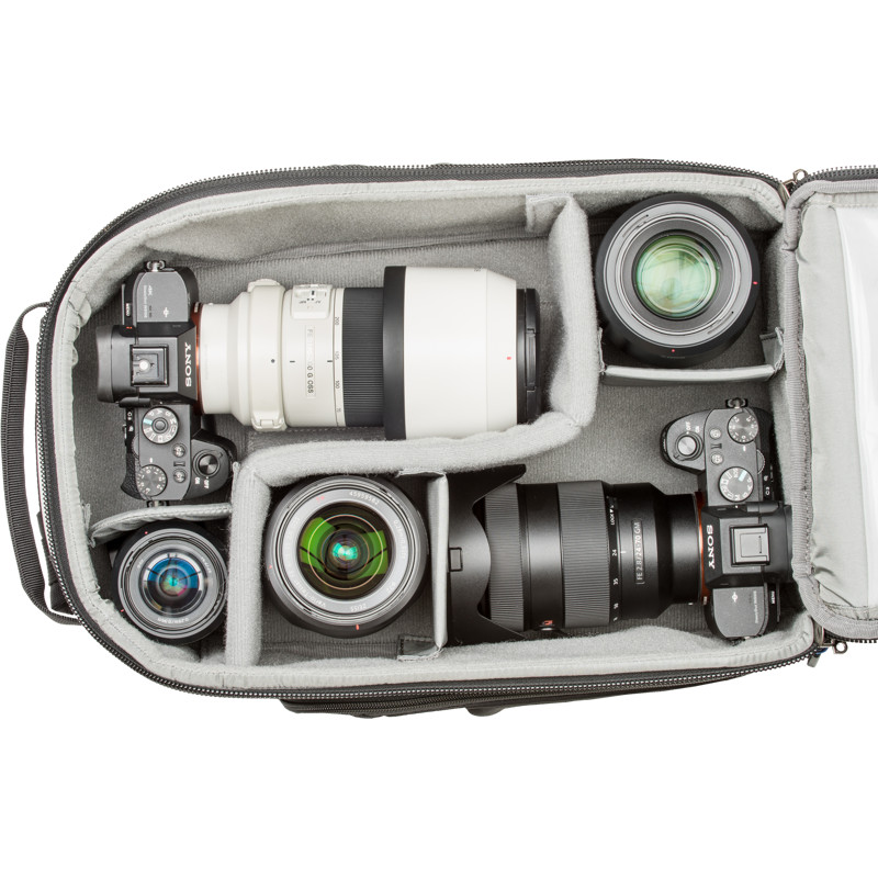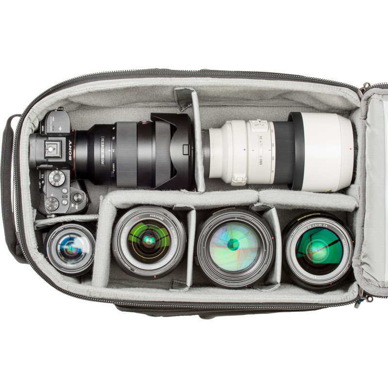 The spacious, padded main compartment with adjustable dividers holds a professional DSLR or mirrorless camera with a 70-200 mm f/2.8 lens attached, four to five additional lenses, a flash, and the included rain cover. Under the lid are zippered mesh pockets for accessories. At the back of the backpack is a compartment for up to a 15" laptop and a 13" tablet. The side pockets are suitable for storing a water bottle, gloves, or other accessories. The stretchy pockets on the shoulder straps are useful for storing sunglasses or other small items. Above each pocket is a D-ring for attaching a front camera or other equipment.