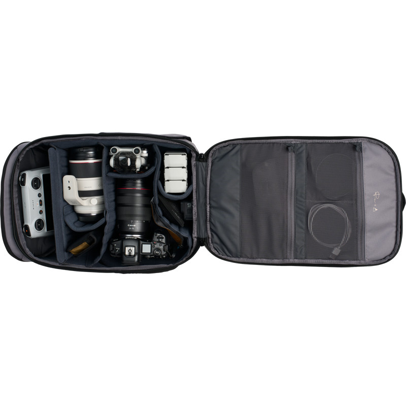 Adjustable dividers allow for flexible equipment organization. There are multiple accessory pockets, a laptop pocket (up to 16"), as well as a special side pocket with a magnetic closure for a water bottle or a compact tripod.