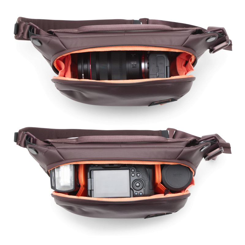 The Everyday Sling 6L can hold any of the following combinations: mirrorless camera with attached lens + 1-2 additional lenses and accessories; DJI Mavic Pro 2 drone + controller, batteries, charger; small DSLR camera with attached lens + 1-2 additional lenses and accessories; DSLR camera with attached lens + 1 additional lens and accessories, as well as full-frame DSLR + 70-200 Pro lens.