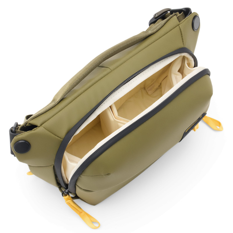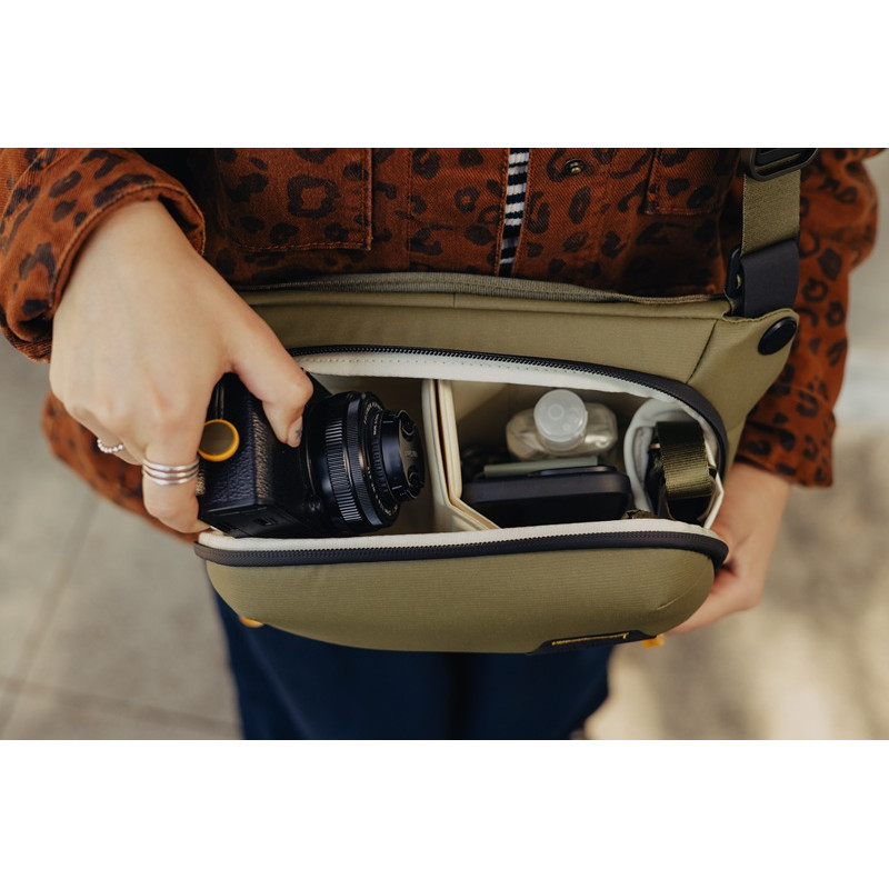 The Peak Design Everyday Sling 3L is a small, compact, versatile bag that can be worn over the shoulder or across the waist. When worn over the shoulder, the bag's padded strap can be adjusted for the right or left shoulder.
