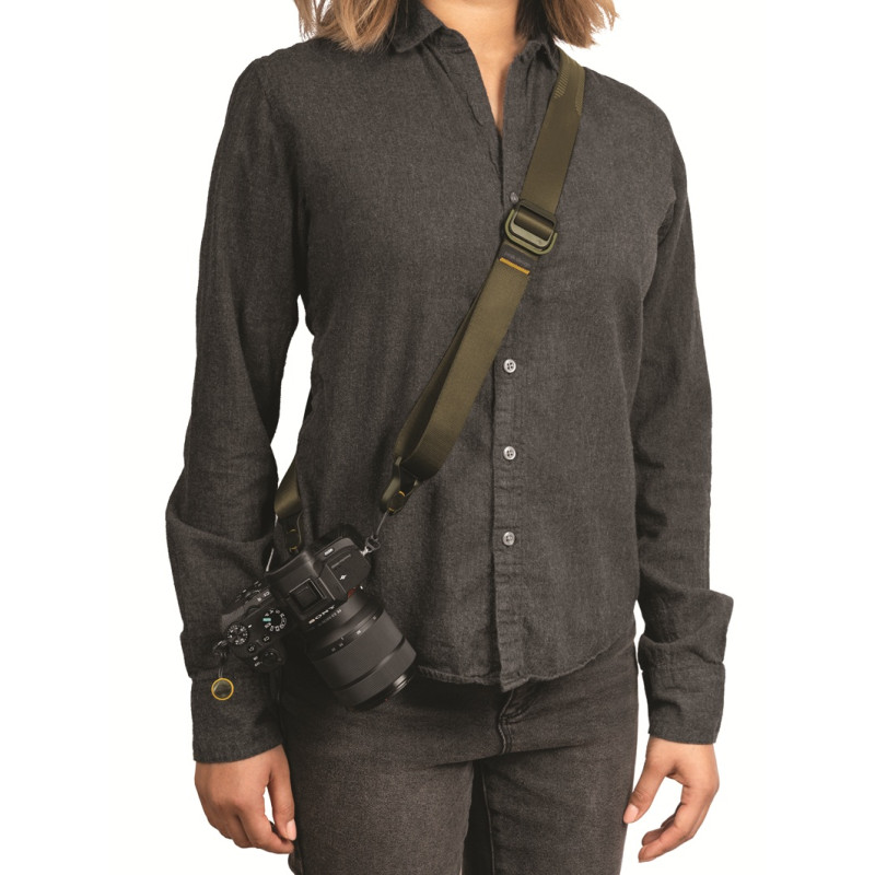 The strap is 32mm wide and is made of nylon webbing that is padded internally to ensure comfort and fit. The two sides of the Strap Slide Lite have different properties: one side is smooth for sliding the camera towards the eye when using it as a sling, and the other side has a silicone finish that prevents slipping when worn around your neck or shoulder.