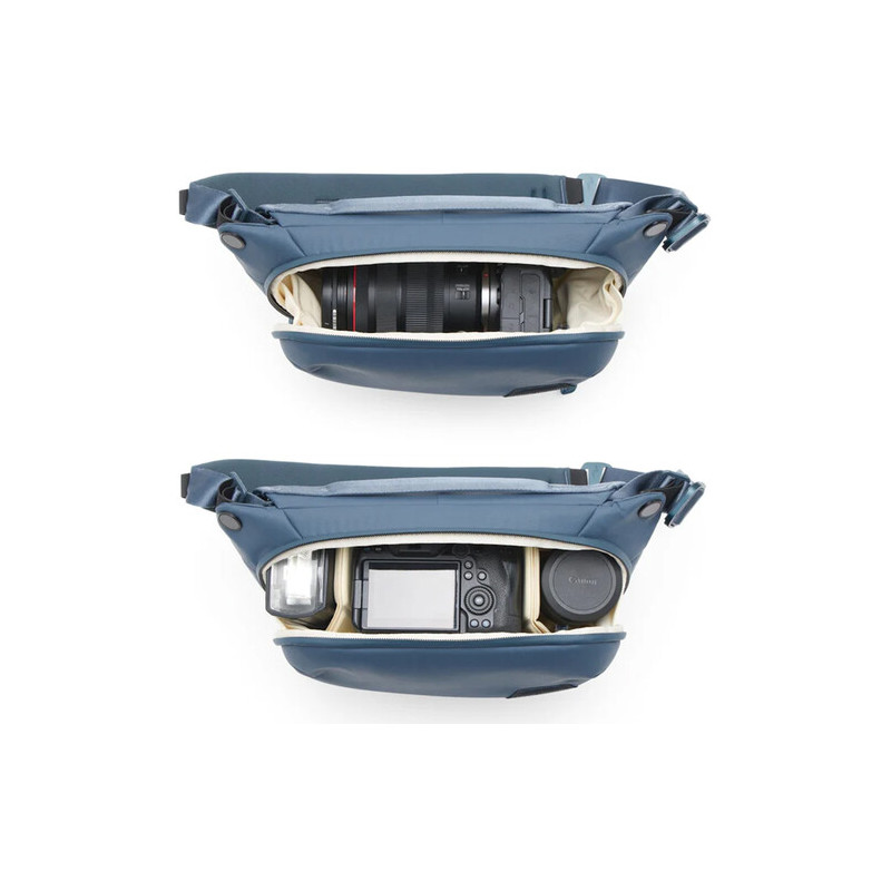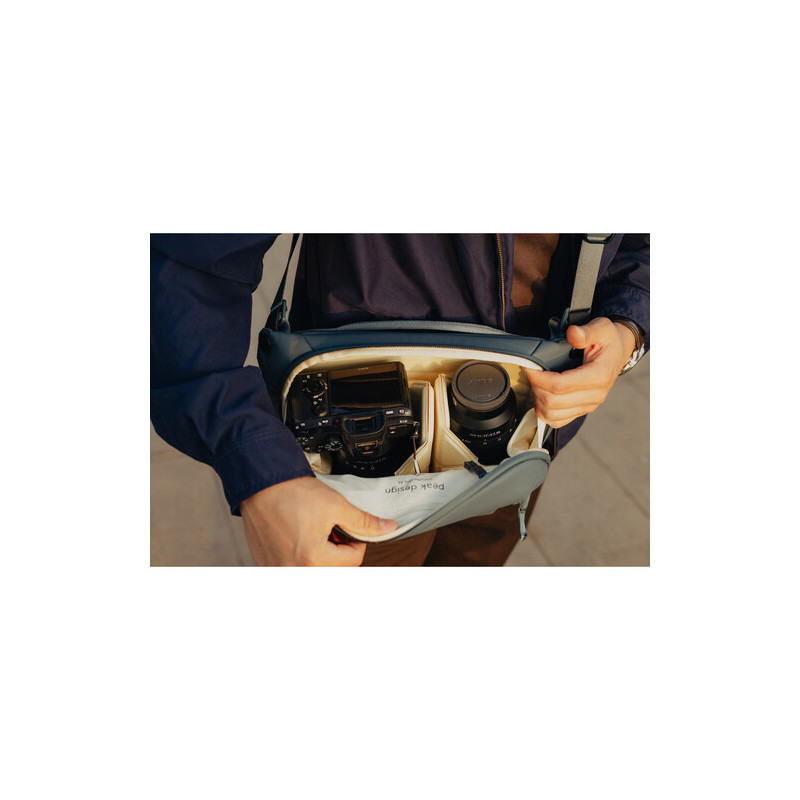 The Peak Design Everyday Sling 6L is a compact, versatile bag that can be worn over the shoulder or across the waist. When worn over the shoulder, the padded strap of the bag can be adjusted for the right or left shoulder. The Everyday Sling 6L can accommodate any of the following combinations: mirrorless camera with attached lens + 1-2 additional lenses and accessories; DJI Mavic Pro 2 drone + controller, batteries, charger; small DSLR camera with attached lens + 1-2 additional lenses and accessories; DSLR camera with attached lens + 1 additional lens and accessories, as well as a full-frame DSLR + 70-200 Pro lens.