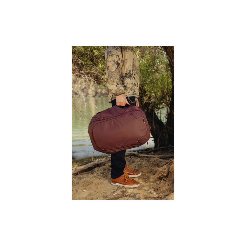 The Peak Design Travel Backpack 45L is made from 100% recycled materials and features a durable, weather-resistant nylon construction and a waterproof bottom panel for added security. It's also compatible with the optional Travel Rain Fly.