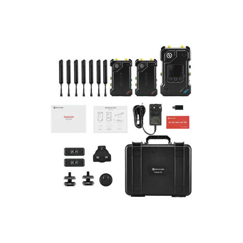 The Hollyland Cosmo C2 transmitter is a professional wireless video transmission kit, including two transmitters and one receiver. The kit is designed for dynamic productions, where simultaneous monitoring of the frame from several locations is required. With a range of up to 120 meters and a stable connection without interference, the Cosmo C2 provides a crystal clear picture with minimal delay and the ability to use SDI or HDMI inputs, suitable for different cameras.Hollyland Cosmo C2 is a professional wireless video transmission kit, including two transmitters and one receiver. The kit is designed for dynamic productions, where simultaneous monitoring of the frame from several locations is required. With a range of up to 120 meters and a stable connection without interference, the Cosmo C2 provides a crystal clear picture with minimal delay and the ability to use SDI or HDMI inputs, suitable for different cameras.