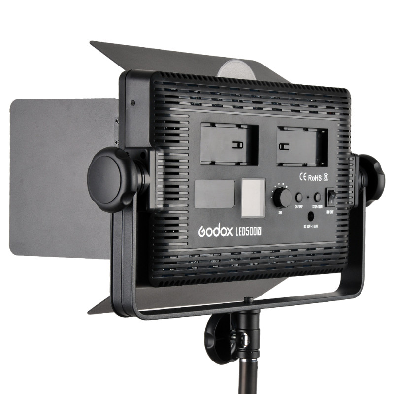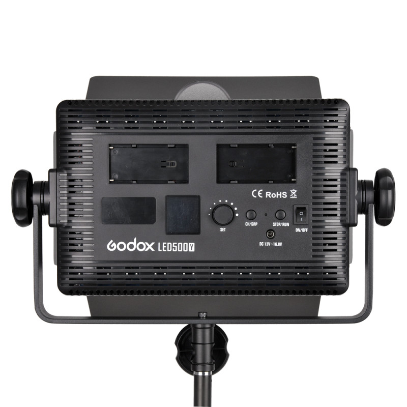 The Godox LED 500C can be used either with mains power via the included adapter or with two Sony NP-F970 batteries (sold separately), making it a practical choice for mobile productions. Additionally, the model is compatible with the Godox RC-A5 remote controller, which has a range of up to 20 meters and allows wireless control of brightness and color temperature settings.