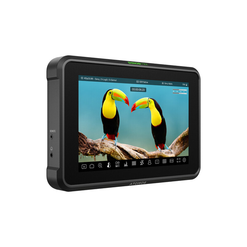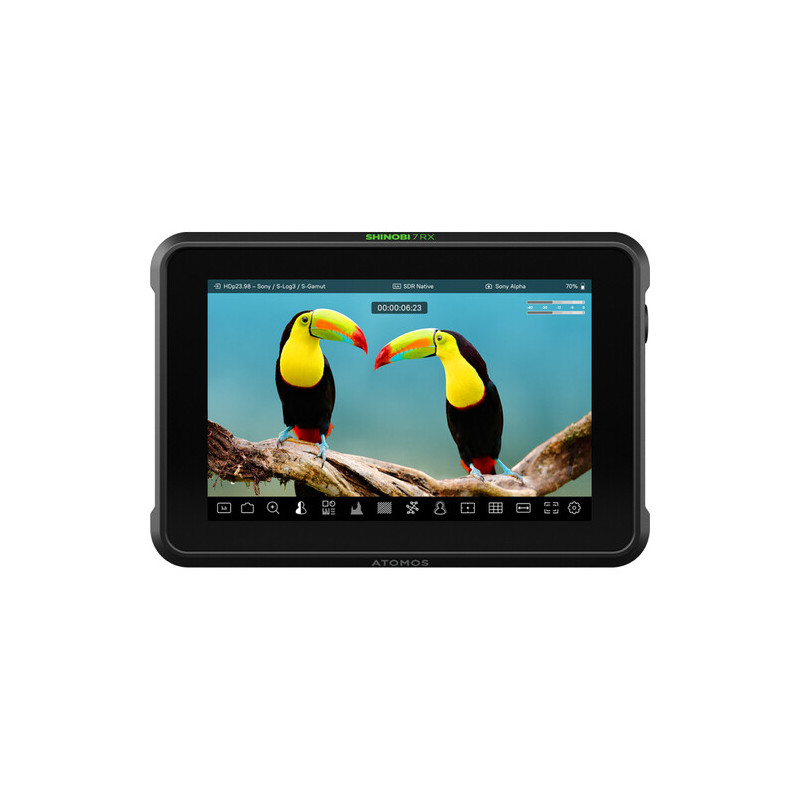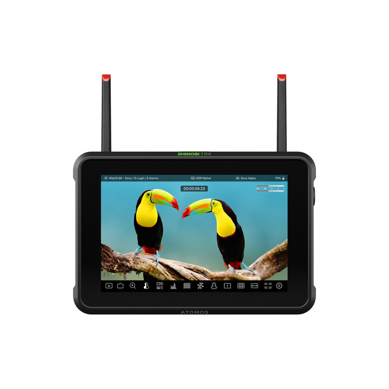 The Atomos Shinobi 7 RX monitor is a professional 7-inch monitor designed for videographers and directors who require precise image control and wireless real-time monitoring. With its HDR IPS display with a brightness of up to 2200 nits, the device provides exceptional visibility even in strong sunlight. The built-in 5G Wi-Fi receiver allows wireless video signal transmission with low latency of less than 60 ms, making it suitable for dynamic shooting situations and mobile productions. The Shinobi 7 RX supports HDMI 2.0 and 3G-SDI inputs and outputs, ensuring compatibility with a wide range of professional cameras and recording devices.