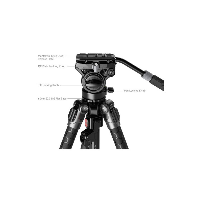 The tripod head offers smooth pan and tilt movement, and has a Flat Base with a 3/8"-16 Female mounting point for secure attachment of the camera and accessories. The included adjustable handle provides fine control over the movement, and the quick-release plate with a double locking mechanism ensures secure camera mounting during dynamic work.