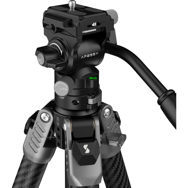 The adjustable center column and video head with 3/8" mount allow for precise panning and tilting up to 360°, and the included quick plate ensures quick attachment and release of the camera. The five leg sections with Flip Lock lock allow for quick extension and folding, and the built-in level ensures accurate positioning. The AP255PRO is suitable for both static and dynamic video shooting, providing reliable support and stability.