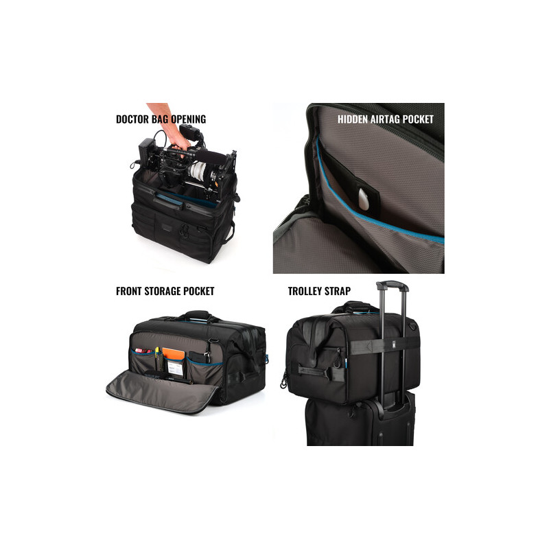 The unique "Doctor Bag" opening system provides extremely wide and clear access to the equipment, which is especially useful when working in a dynamic environment. The interior is well organized with adjustable dividers, protective cushions for lenses and small accessories.
