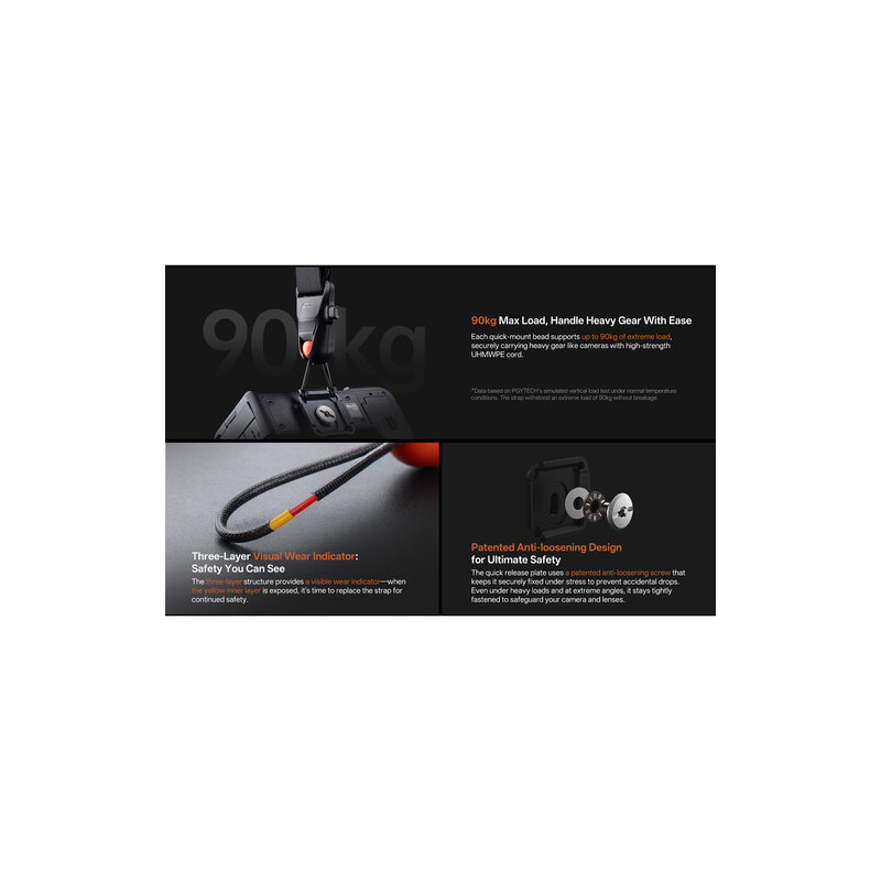 The connecting loops are made of a three-layer woven structure, including a special inner layer with a visual wear indicator that clearly shows when it is time to replace. The material is UHMWPE high-strength thermoplastic polyethylene, which is up to 10 times stronger than steel rope, resistant to abrasion and able to withstand a load of up to 90 kg. This ensures long-term reliability even when used with heavy DSLR or mirrorless cameras with professional lenses.